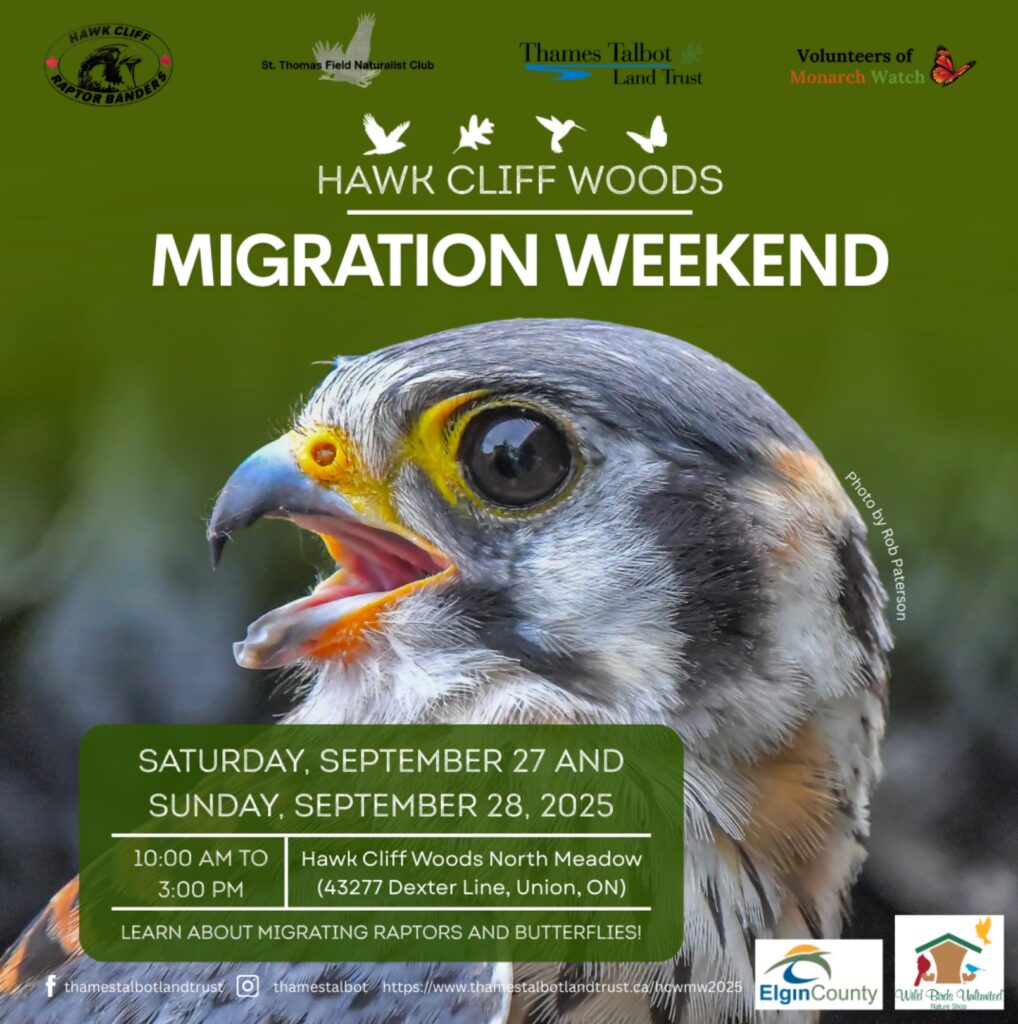 Join Thames Talbot Land Trust in celebrating the spectacular fall migration of hawks and other raptors, and Monarch butterflies at the Hawk Cliff Woods Migration Weekend! This is a free, outdoor, family-friendly event that is the perfect opportunity to explore and learn about the lives and conservation of migratory raptors and Monarch butterflies. To learn more, visit https://www.thamestalbotlandtrust.ca/hcwmw2025.